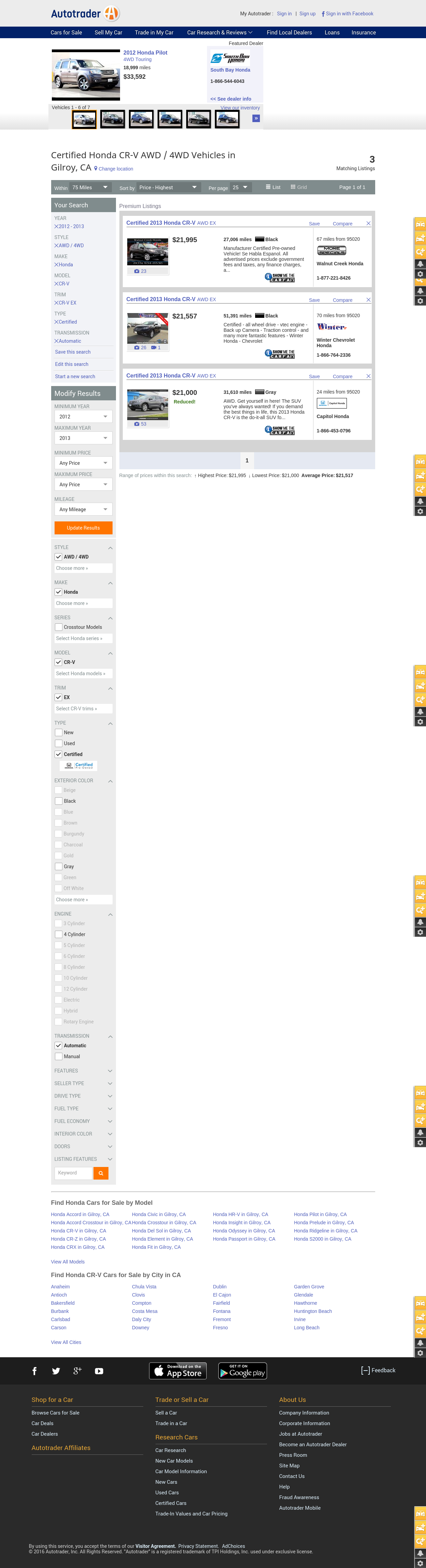 I sent you a list of replacement vehicles. I’m attaching it again. These are the only cars listed on Autotrader.com that are 2012-2013 Honda CR-V EX AWD Dealer Certified cars in 75 mile distance that are available. You can see in the image what my selection criteria was.